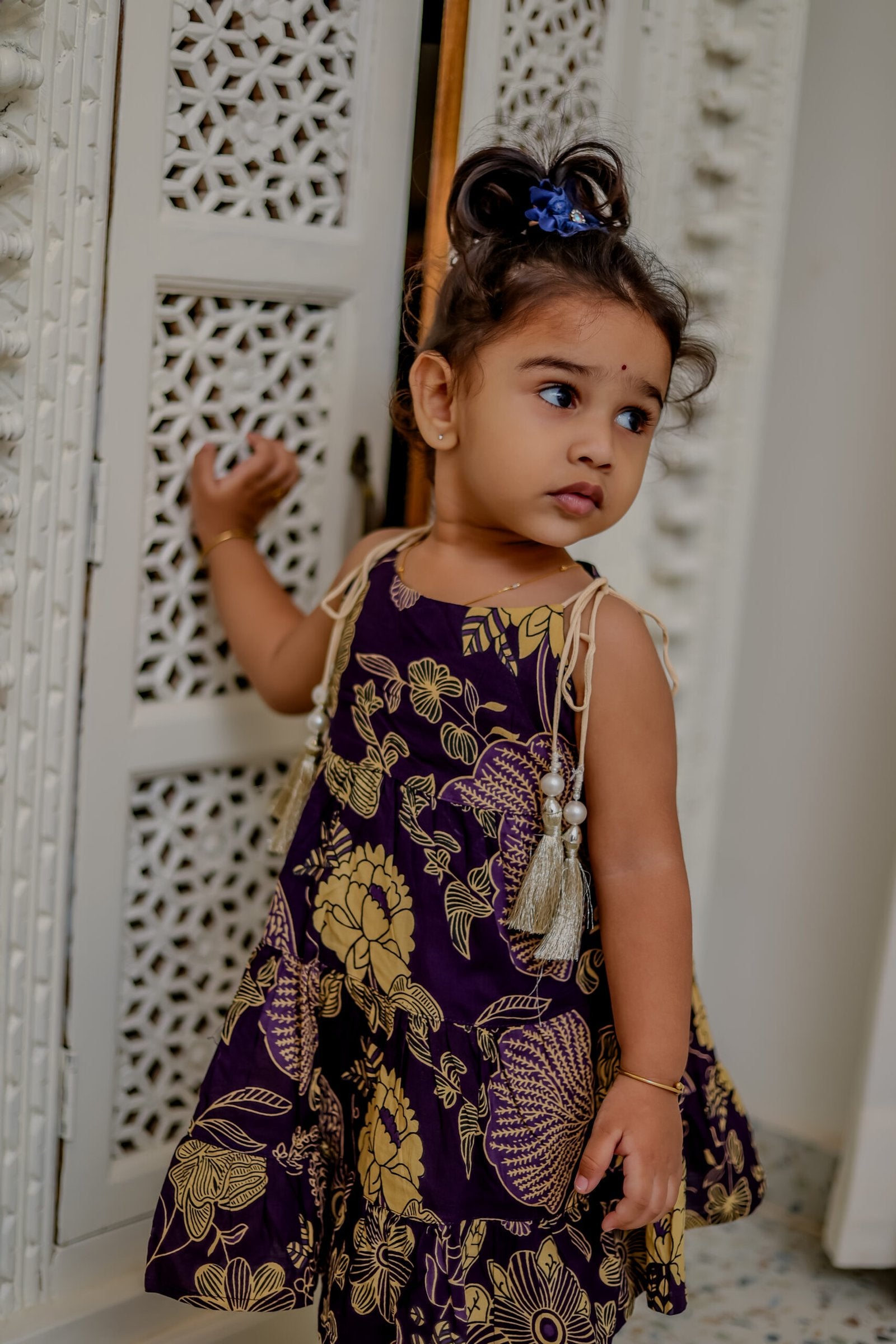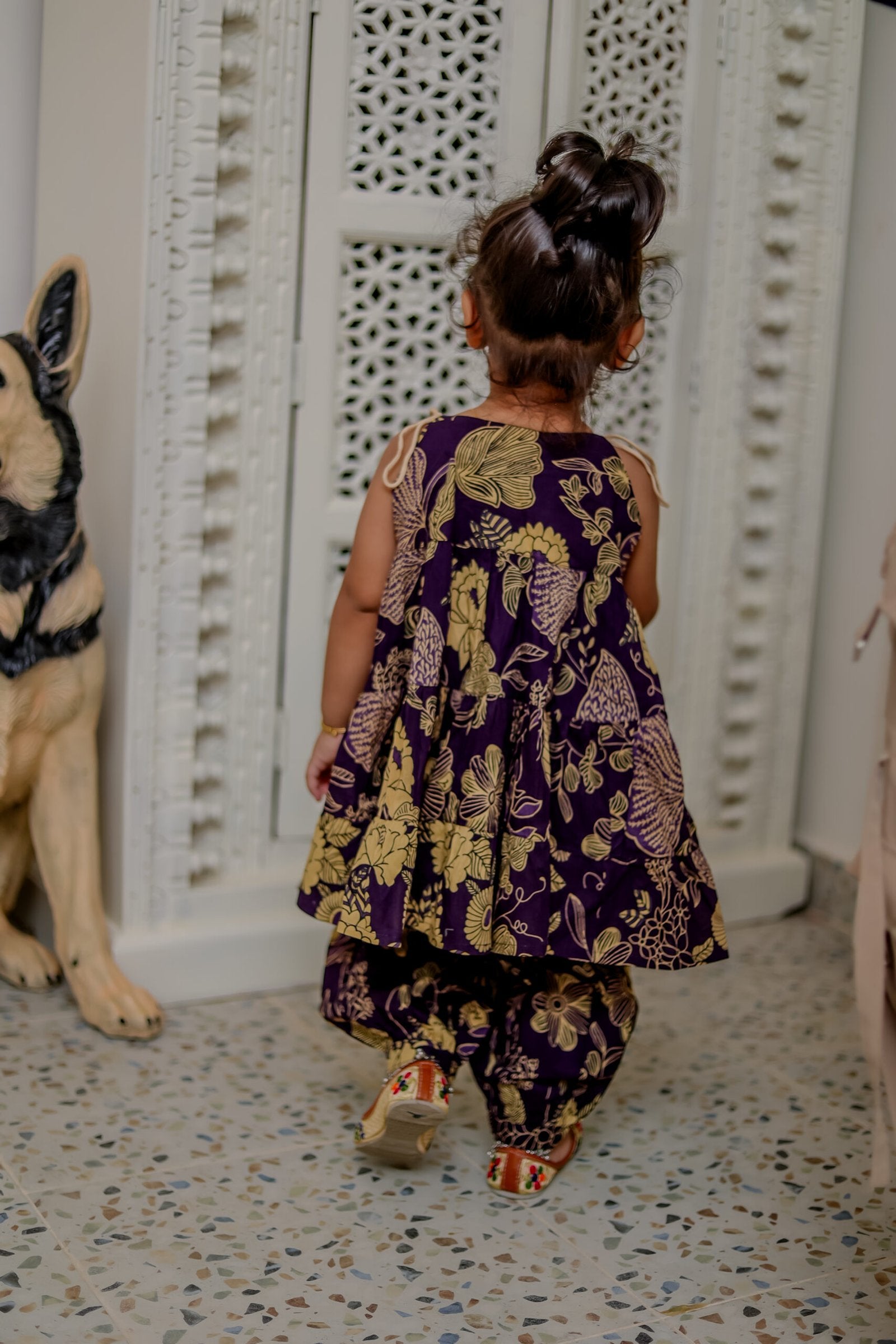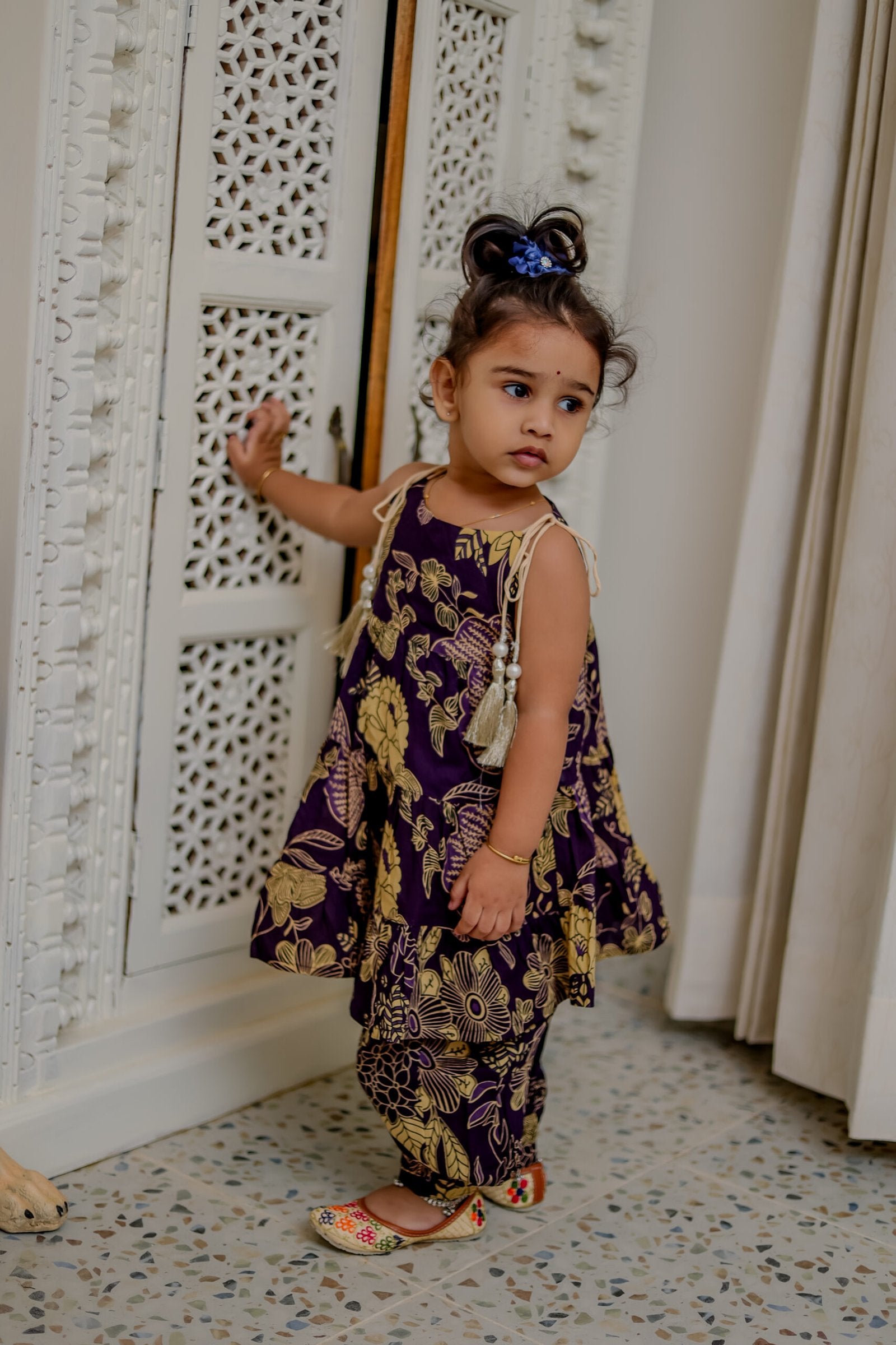 Give your little one a chic festive look with this floral print ethnic sharara set. The sleeveless kurti comes with tie-up shoulder straps adorned with tassels for added charm. The tiered flare style pairs beautifully with the dhoti-style bottoms, offering both comfort and elegance.