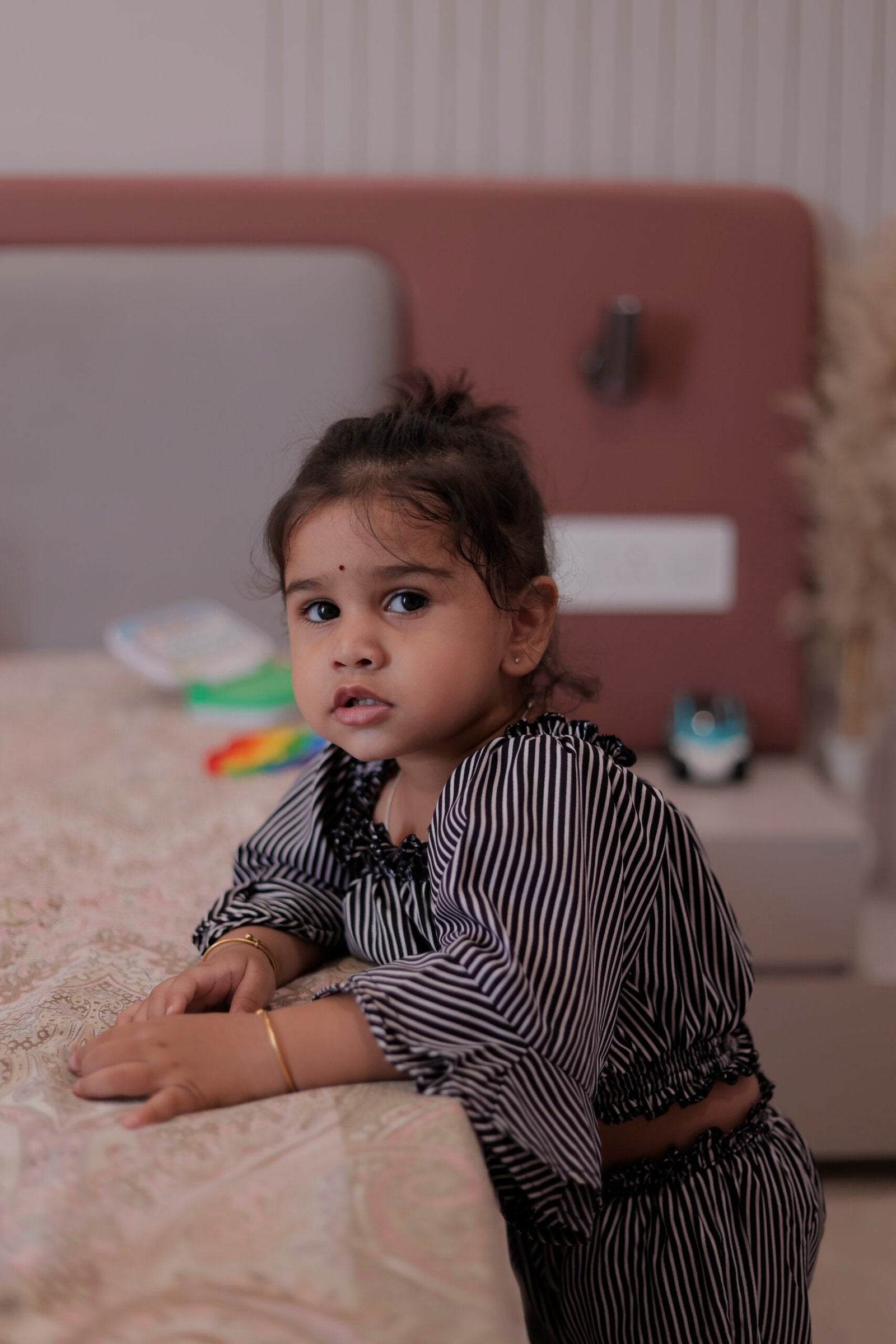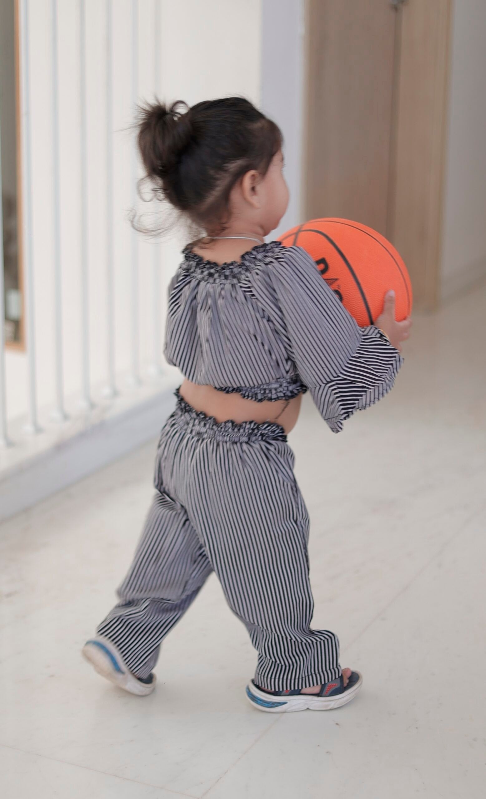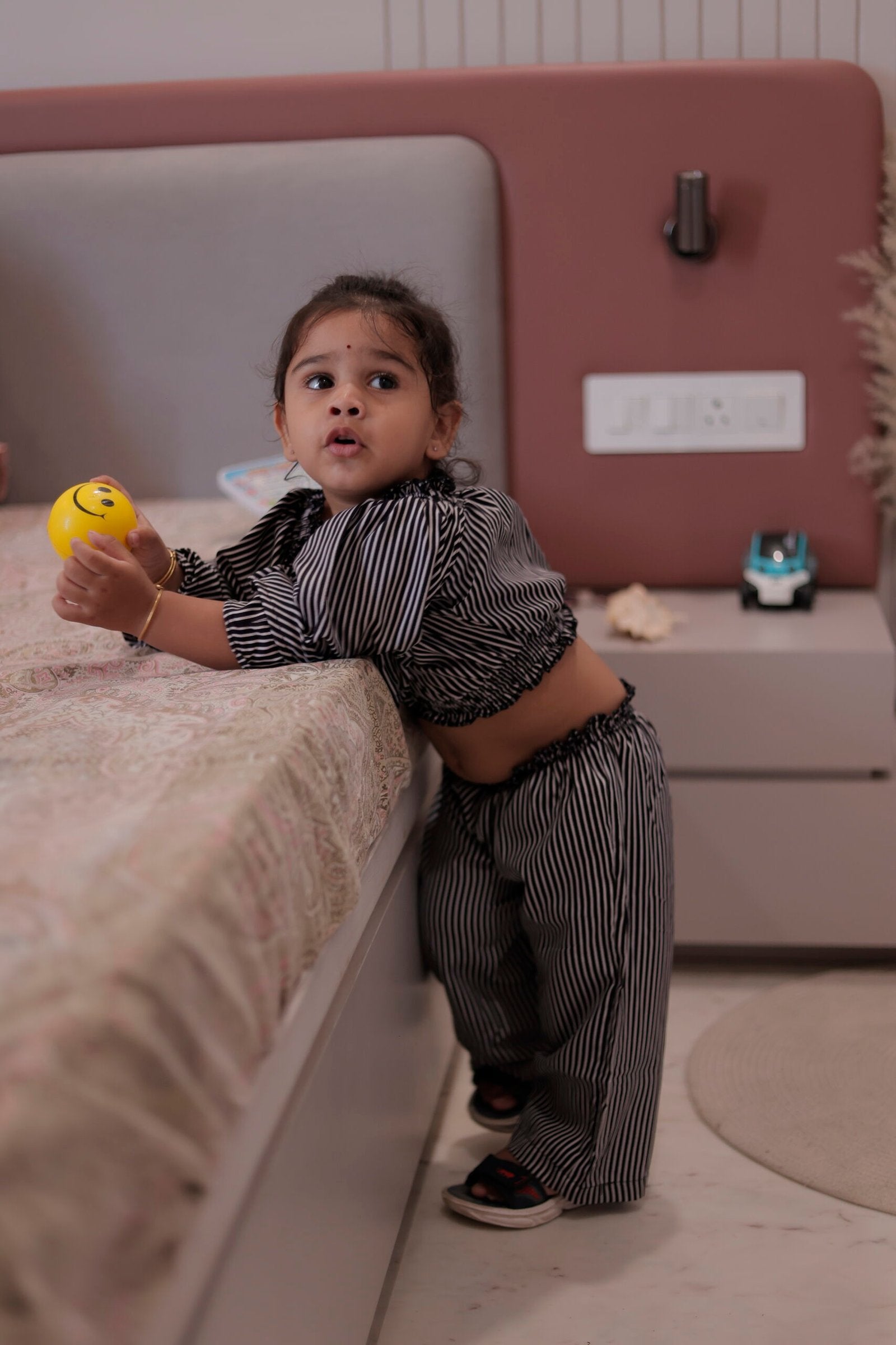 Add a dash of playful charm to your girl’s wardrobe with this ultra-stylish striped co-ord set. The off-shoulder frilled neckline gives a chic look while the wide sleeves and relaxed-fit pants ensure comfort with flair. Whether it’s a casual outing, birthday party, or a day at preschool – this outfit stands out!