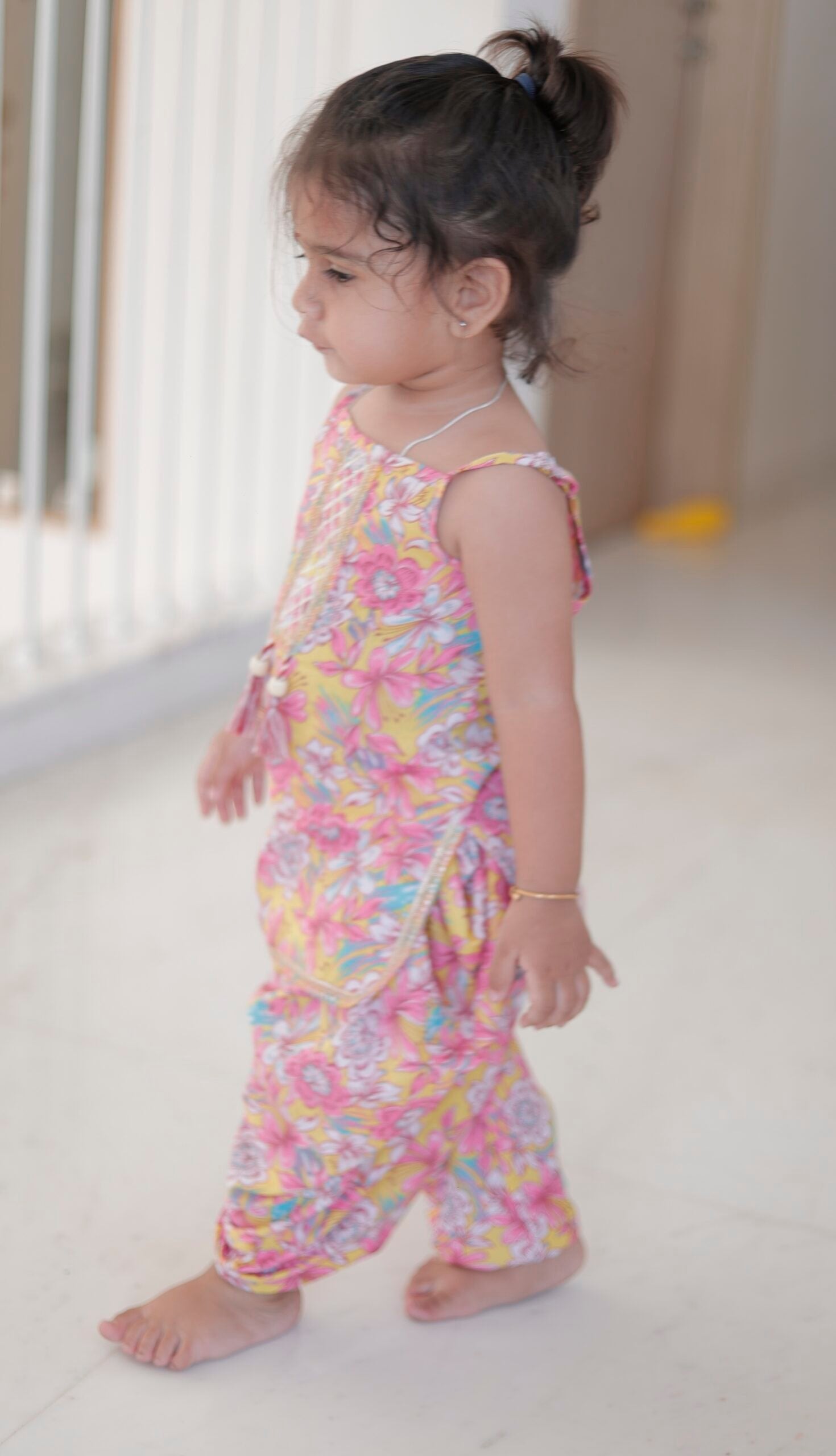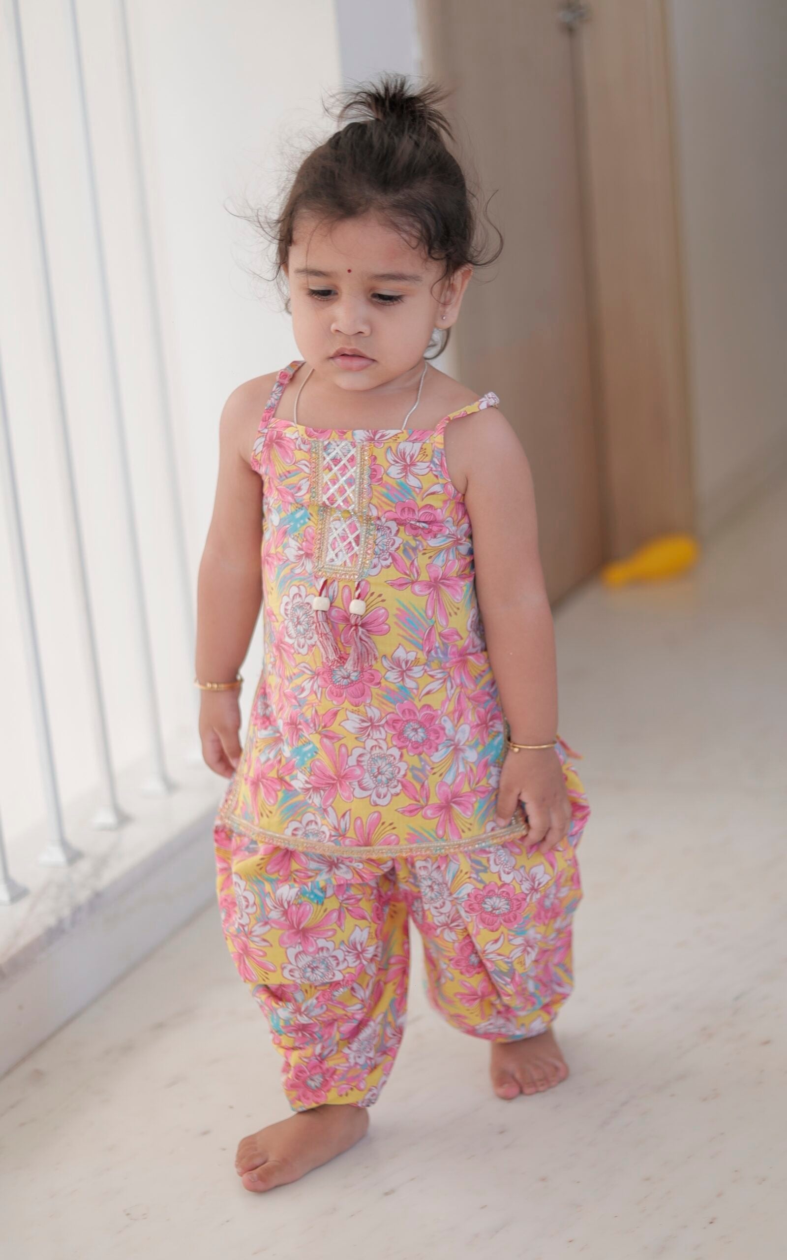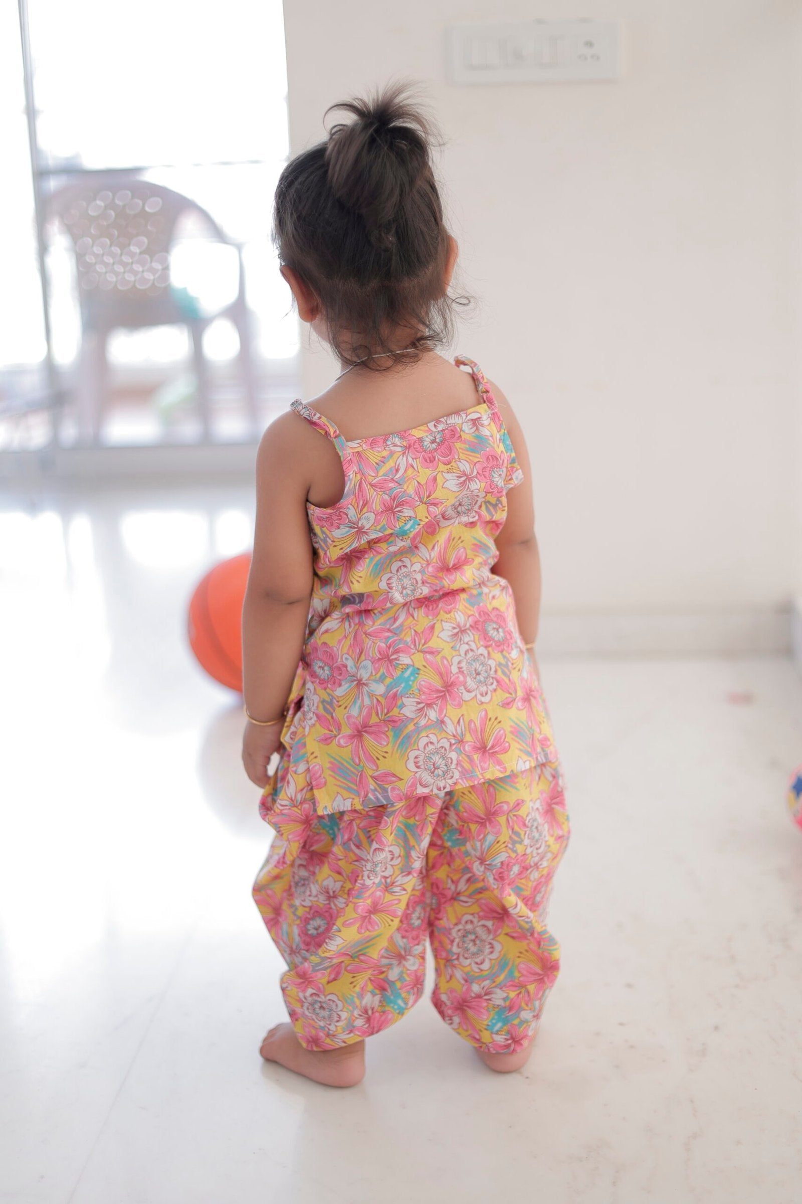 Give your little princess a cheerful and stylish ethnic look with this vibrant yellow & pink floral Patiala set. Made from soft, breathable fabric, this sleeveless kurti with detailed embroidery and cute tassels pairs perfectly with matching Patiala pants.