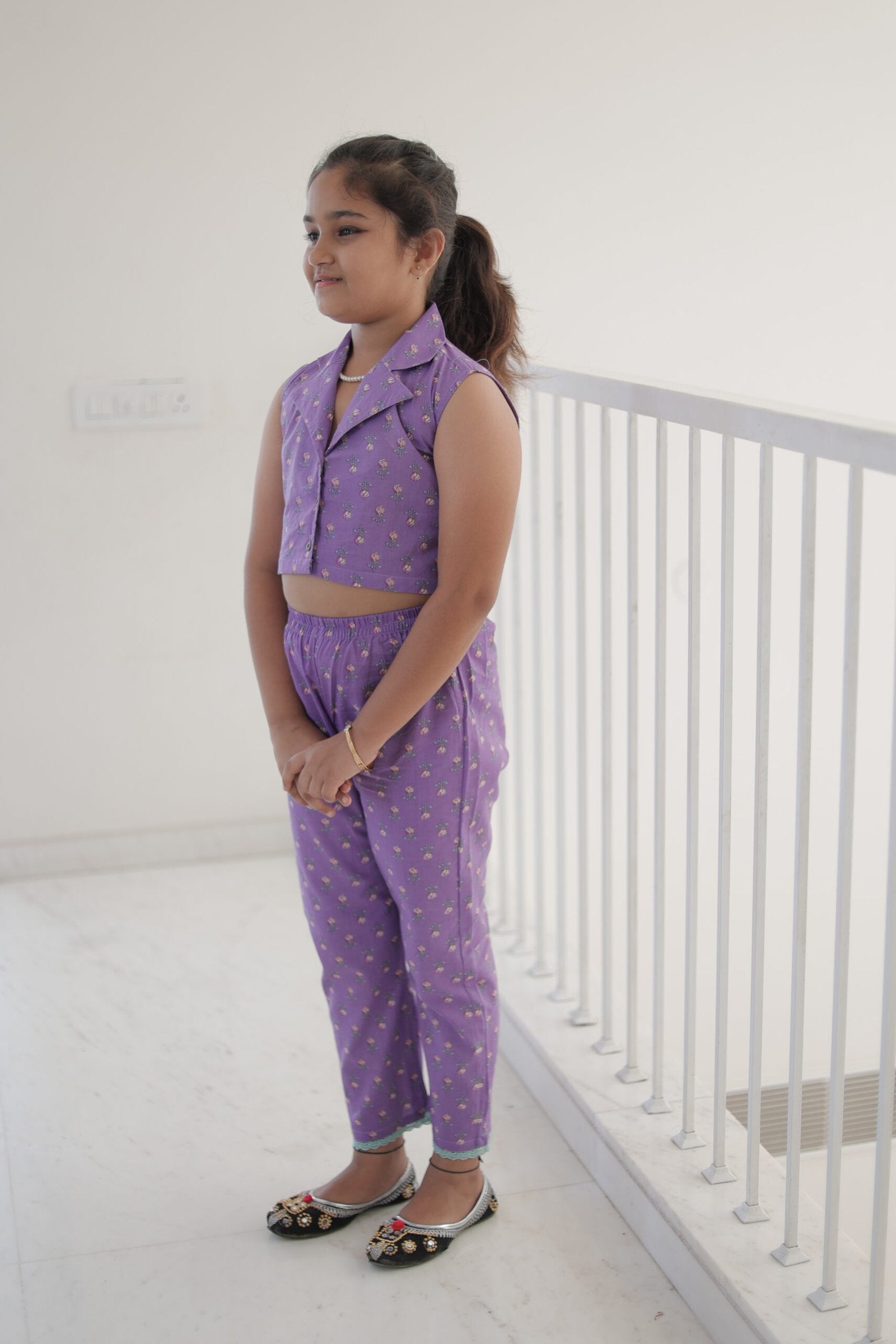 This charming lilac coord set is designed for young fashionistas who love both tradition and comfort. The set includes a sleeveless shirt-style top with front buttons and a smart collar, paired with soft, breathable pants adorned with golden floral buti work and cute turquoise lace at the hem. Great for festive events, weddings, parties, or even casual outings!