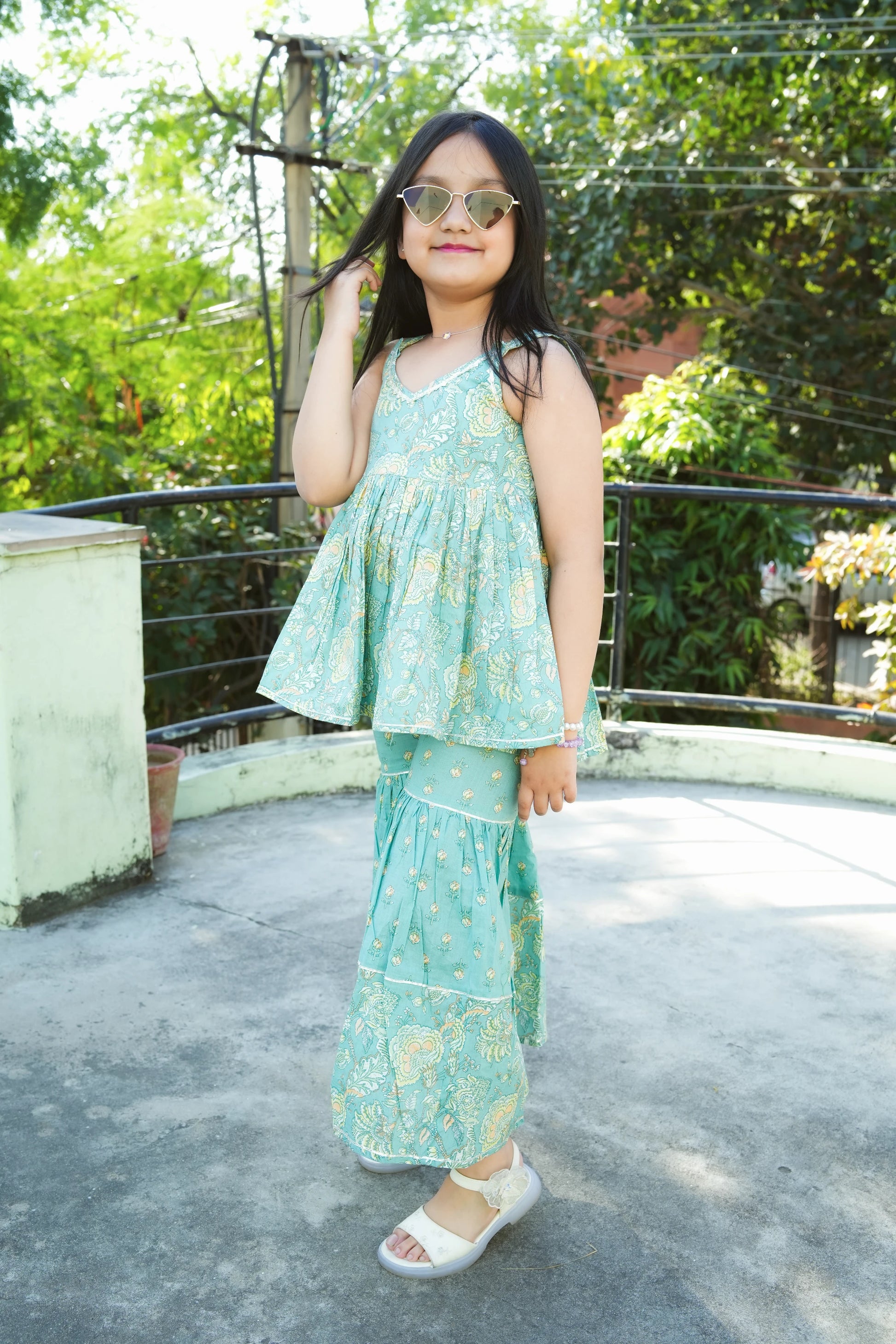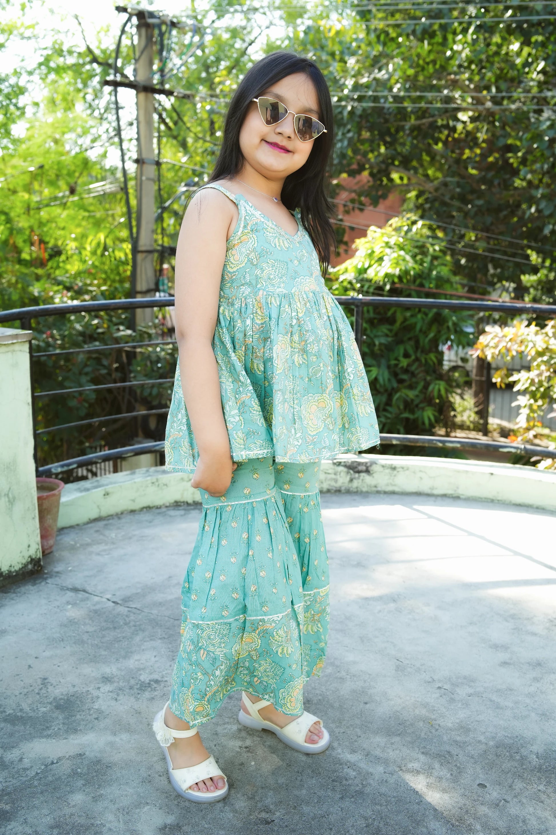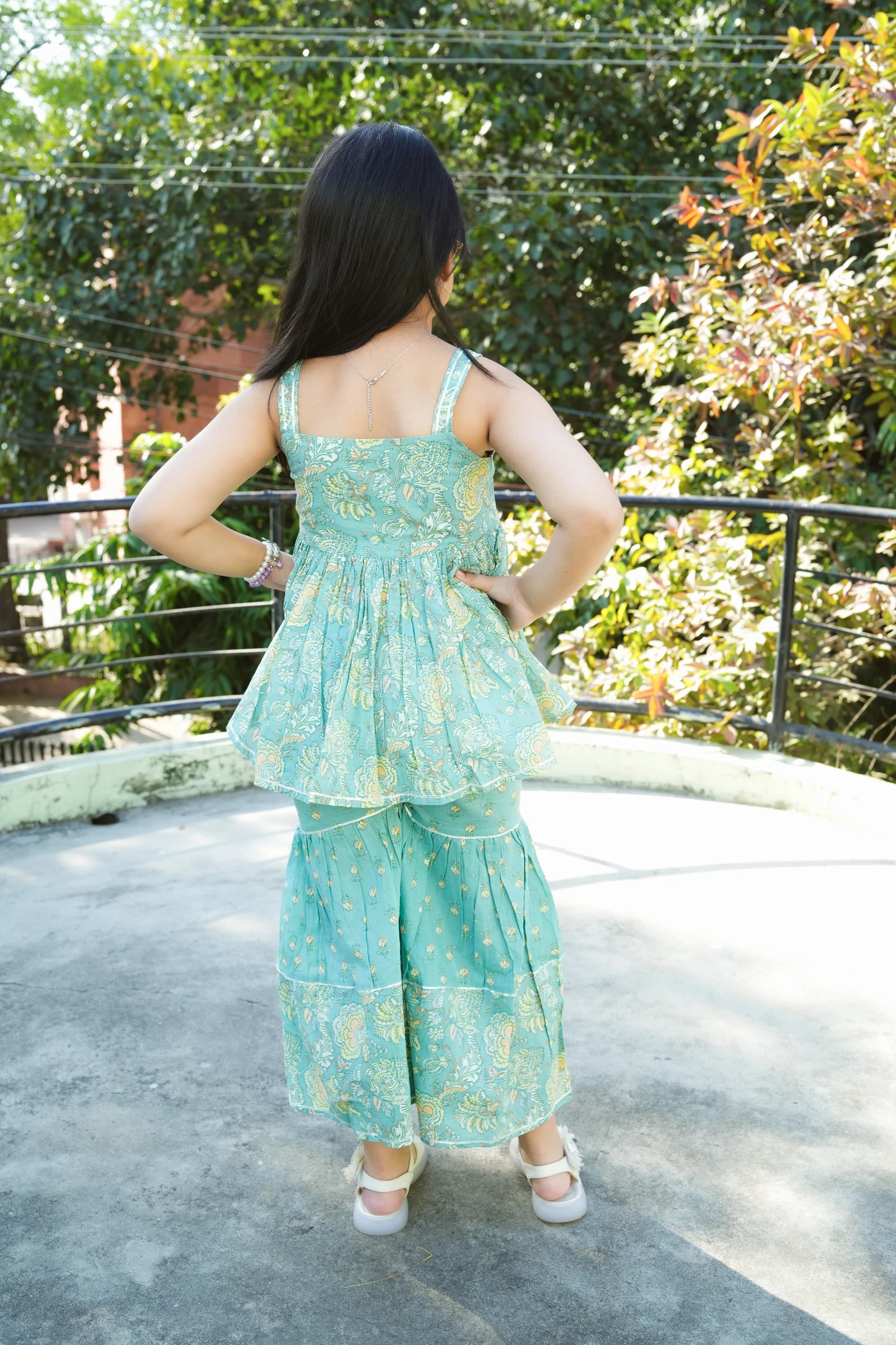 Elevate your wardrobe with this stunning sea green co-ord set, featuring intricate leaf embroidery that brings nature-inspired elegance to everyday wear. The peplum top adds a flattering silhouette while the sharara pants offer comfortable, contemporary styling. Crafted for both girls and women, this versatile ensemble transitions seamlessly from casual outings to festive occasions. The detailed embroidery work showcases quality craftsmanship, making it a standout piece that combines traditional artistry with modern fashion sensibilities. Perfect for those seeking distinctive, well-designed clothing that celebrates individuality.