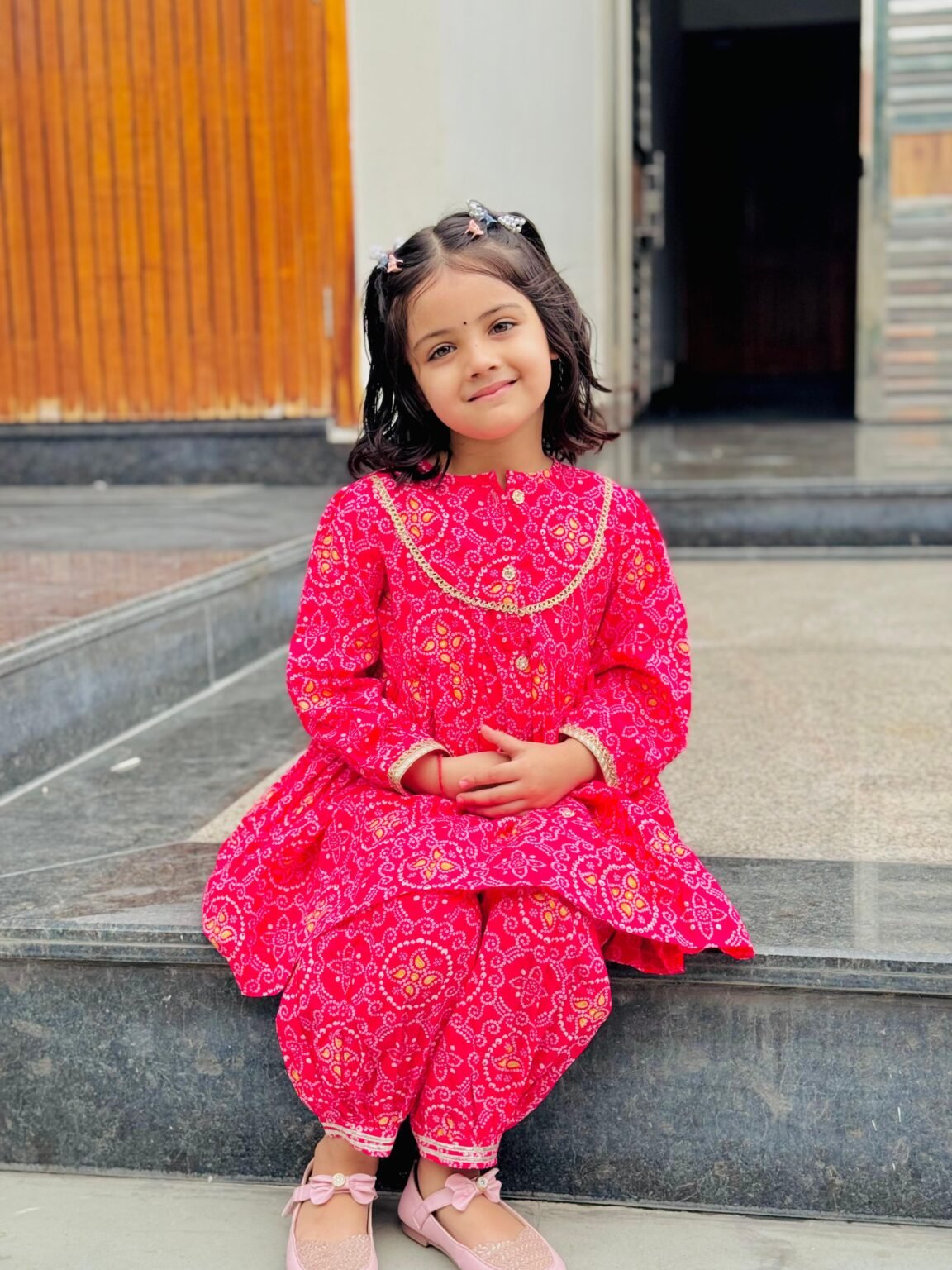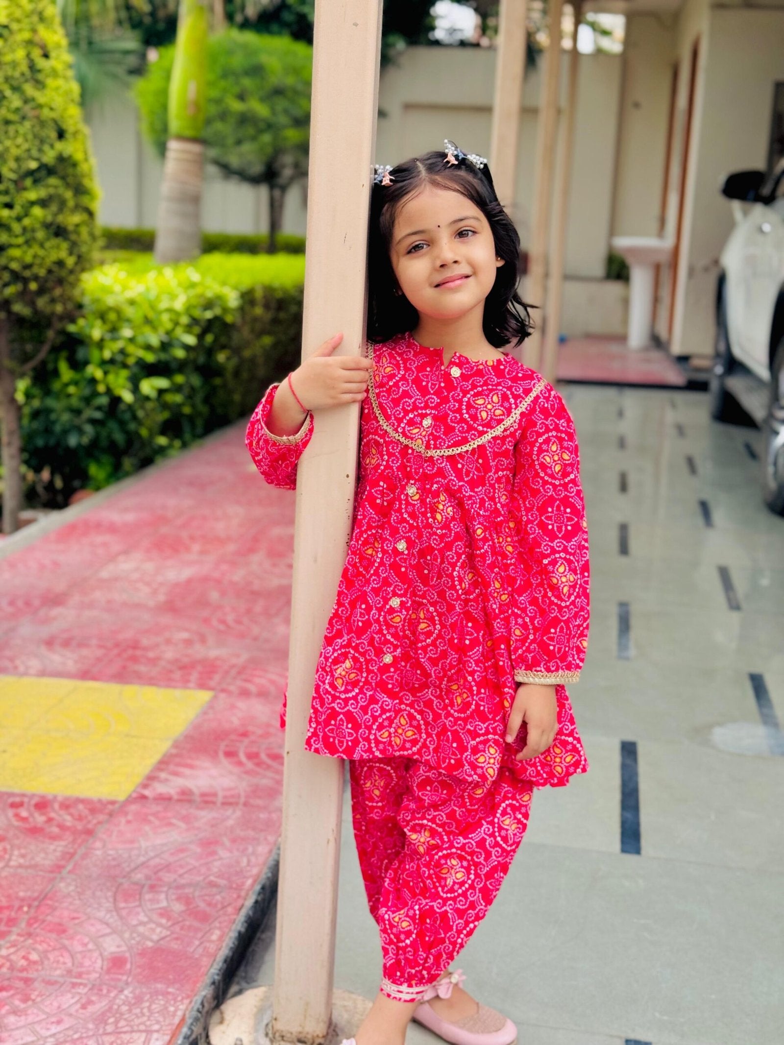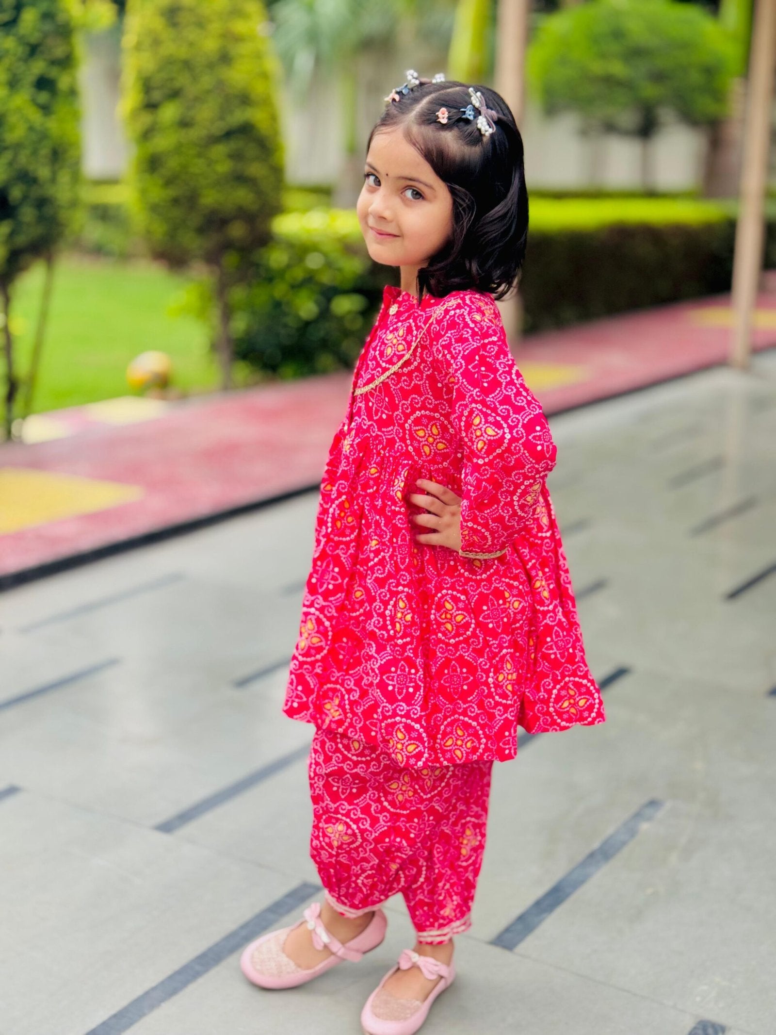 Dress your little one in vibrant tradition with this stunning pink Bandhani print kurta and Patiala set. Crafted from soft, breathable cotton fabric, the set ensures comfort throughout the day while maintaining a charming ethnic look. The kurta features a detailed traditional Bandhani print with a front button closure and stylish golden lace detailing around the neckline. Paired with a matching Patiala-style salwar and soft elastic waist for ease of wear, it’s the perfect festive or everyday ethnic wear for your princess.