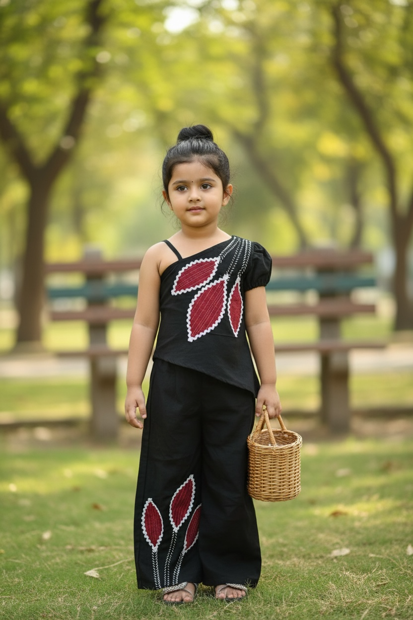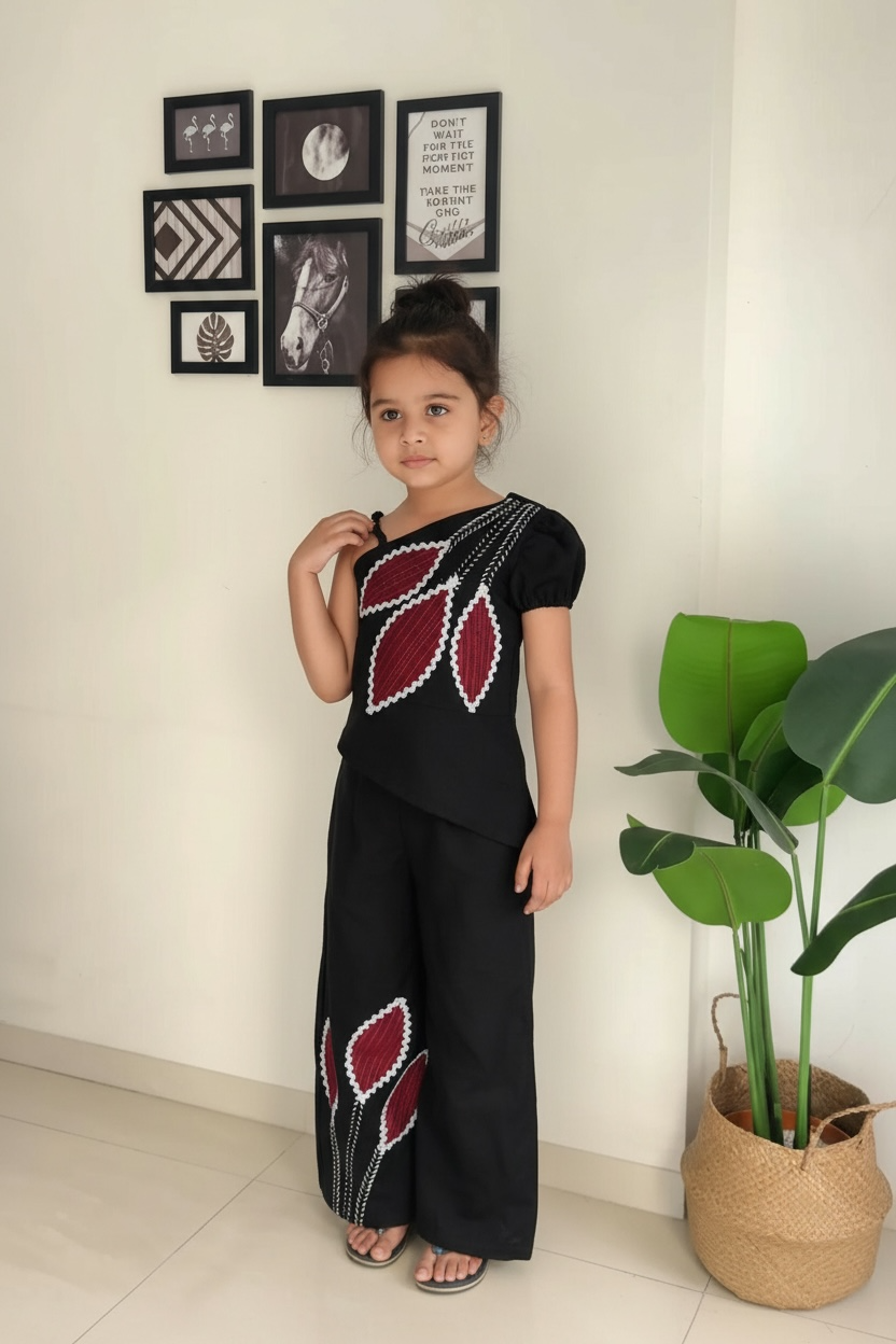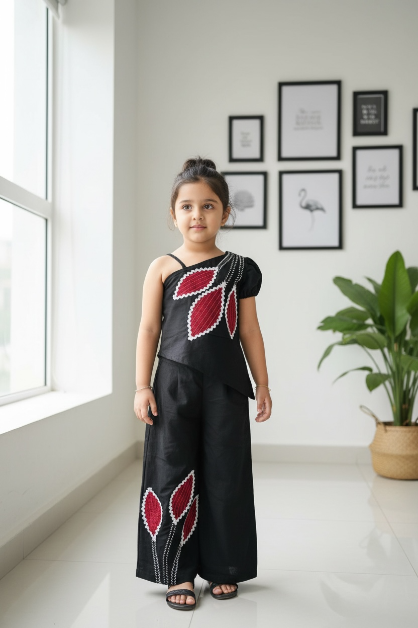 Elevate your wardrobe with this sophisticated cotton flex co-ord set, expertly crafted for modern women. The top features an asymmetric cut with one-shoulder design and delicate lace detailing, complemented by intricate patchwork embroidery that creates visual interest. Matching patch design work extends to the wide-leg trousers, ensuring a cohesive, curated look. The flexible cotton blend offers comfort without compromising on style, making this set ideal for both casual outings and semi-formal occasions. The unique asymmetric silhouette and coordinated embellishments deliver an effortless yet polished aesthetic that stands out from conventional designs.