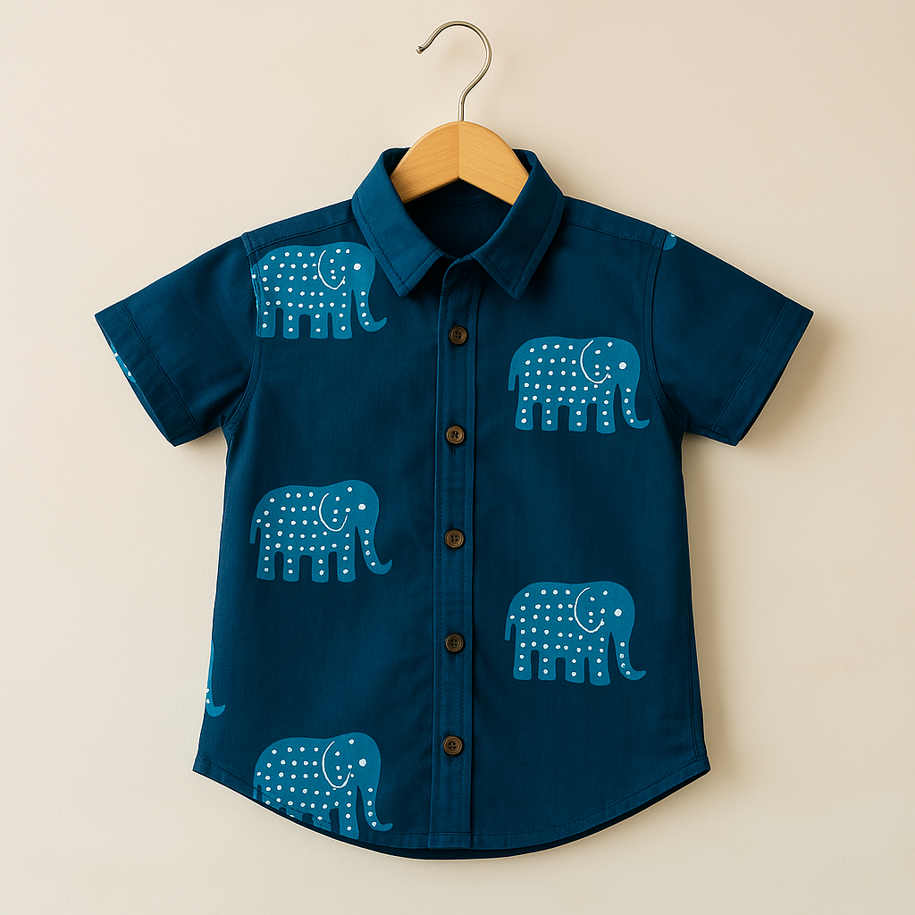 Add a splash of fun and tradition to your child’s wardrobe with this exclusive blue elephant print shirt by Borncry. Designed for comfort and crafted in 100% breathable cotton, this shirt is soft on the skin and perfect for active kids. The cute black elephant motifs bring an ethnic yet playful vibe – ideal for casual days, festive occasions, or family get-togethers. Finished with a neat collar, short sleeves, and button-down front, this shirt ensures both charm and ease.