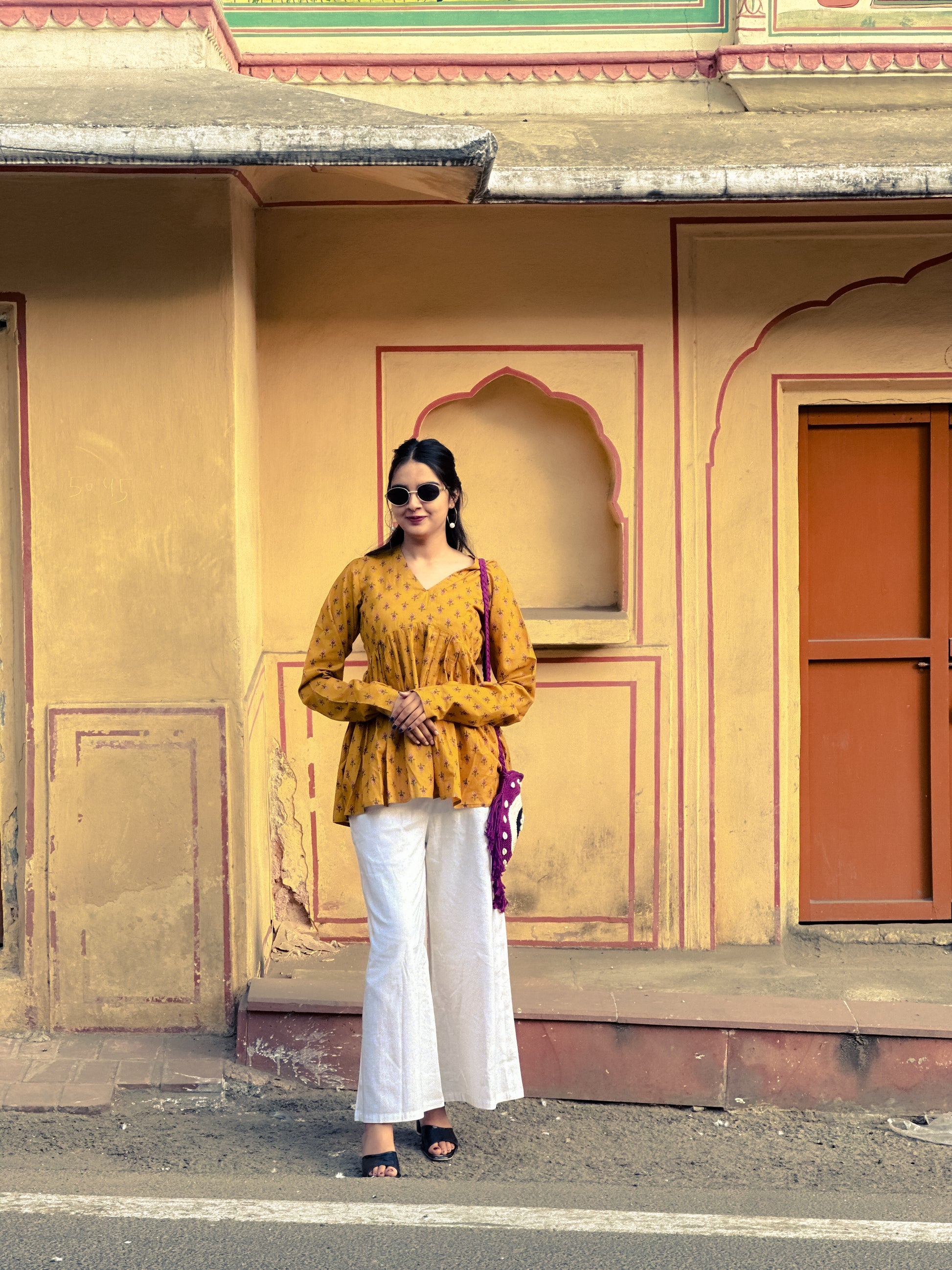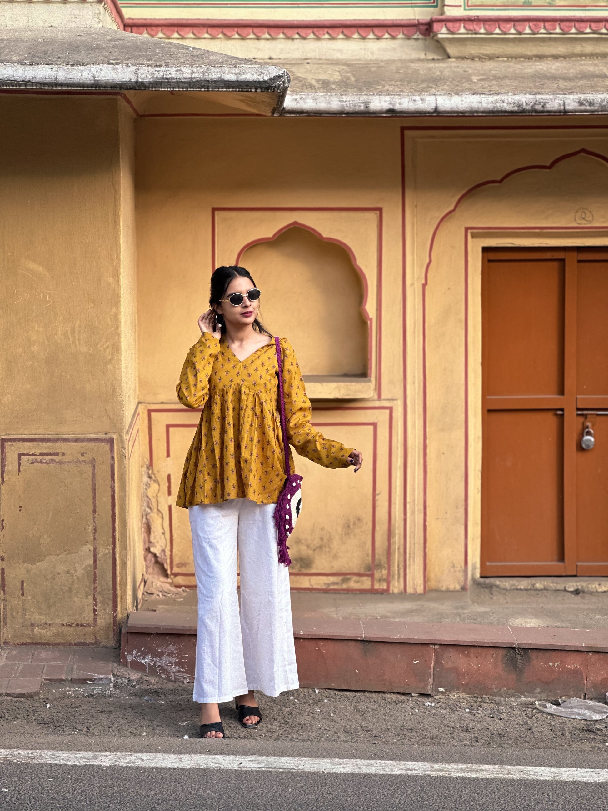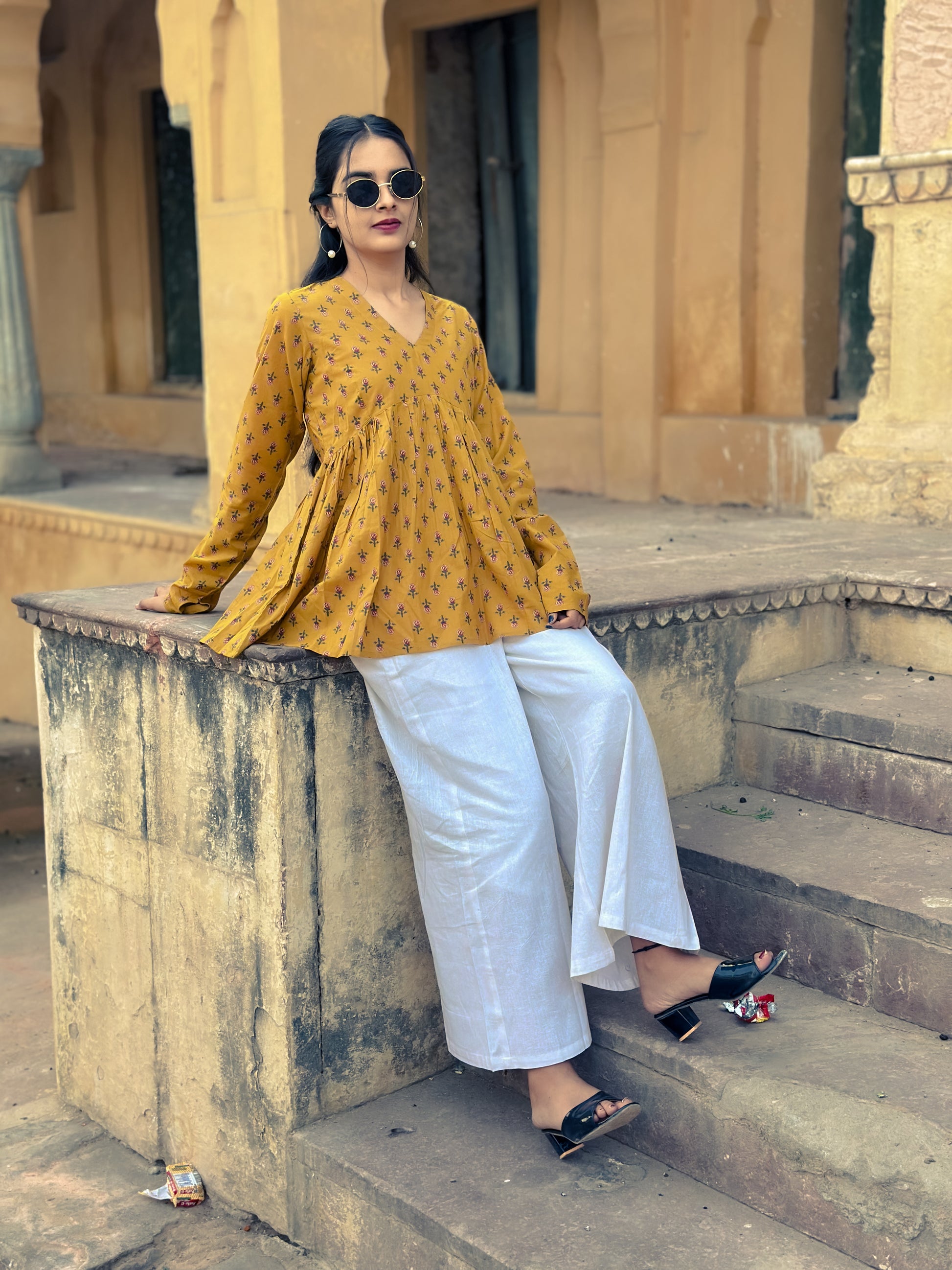 This mustard yellow v-neck kurti showcases an elegant floral print that seamlessly blends traditional craftsmanship with contemporary design. The flattering v-neckline adds a refined touch while maintaining the modest elegance characteristic of quality ethnic wear. The warm mustard base provides a universally flattering canvas, while the intricate floral motifs introduce visual sophistication and movement to your silhouette. Ideal for layering with dupattas or wearing standalone, this versatile piece transitions effortlessly from daily wear to festive occasions. Crafted for the discerning woman who values both comfort and style, this kurti represents a thoughtful investment in timeless ethnic fashion that celebrates individuality and grace.