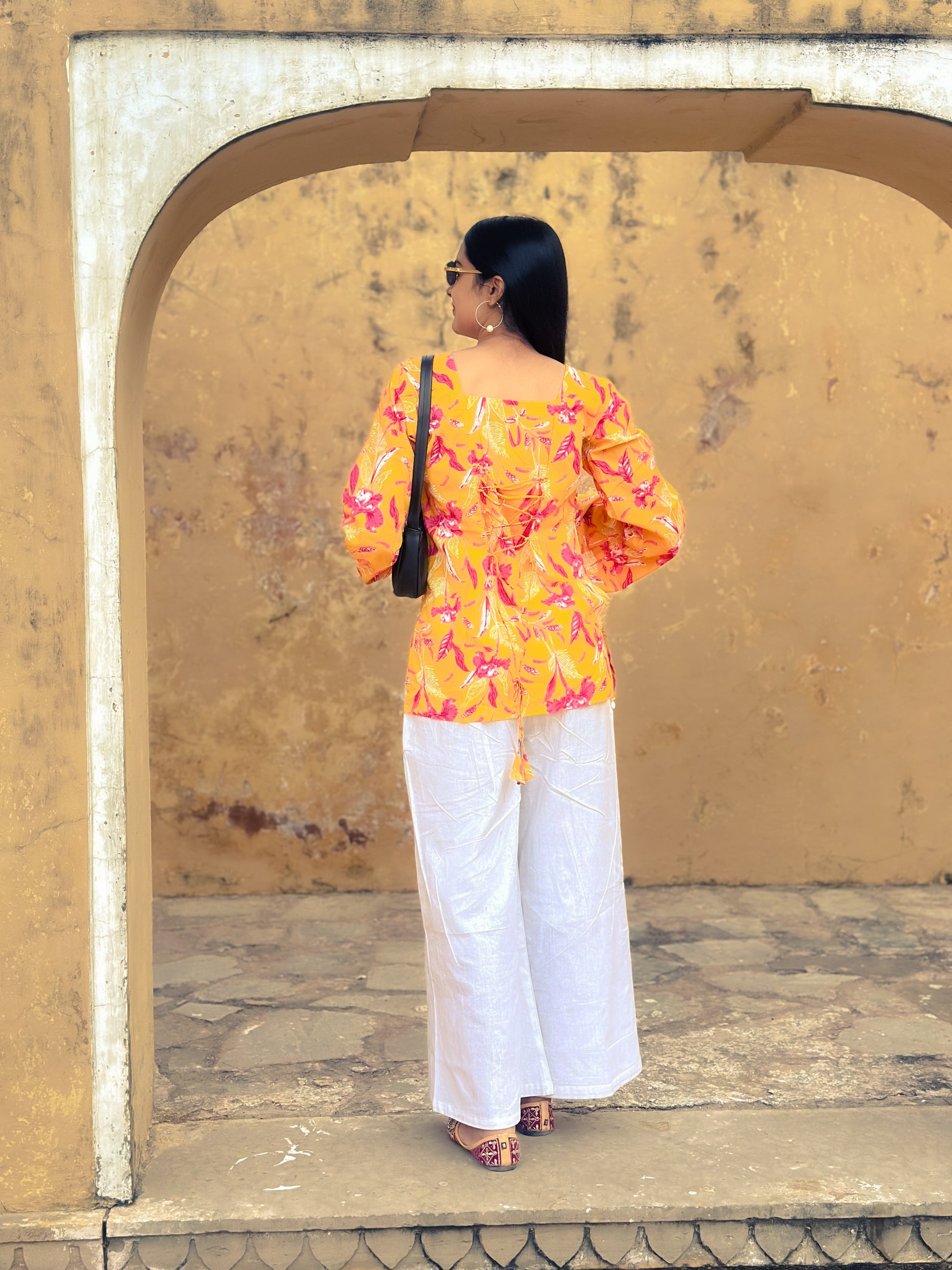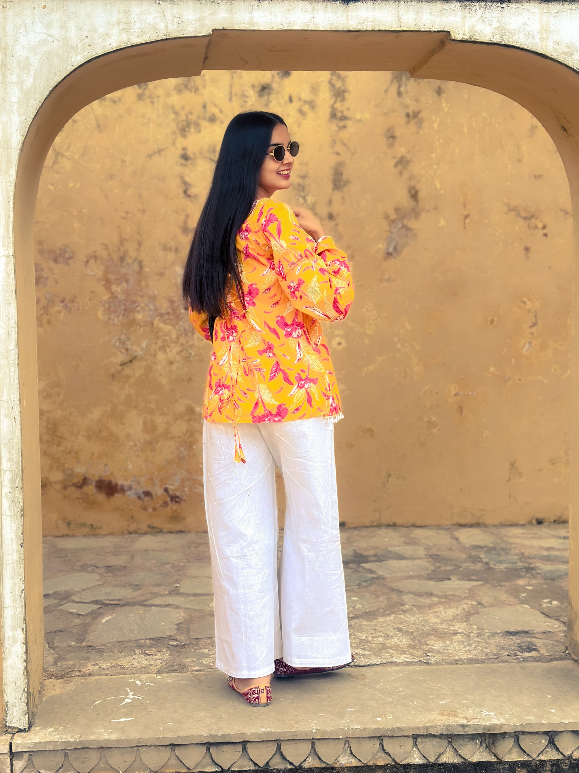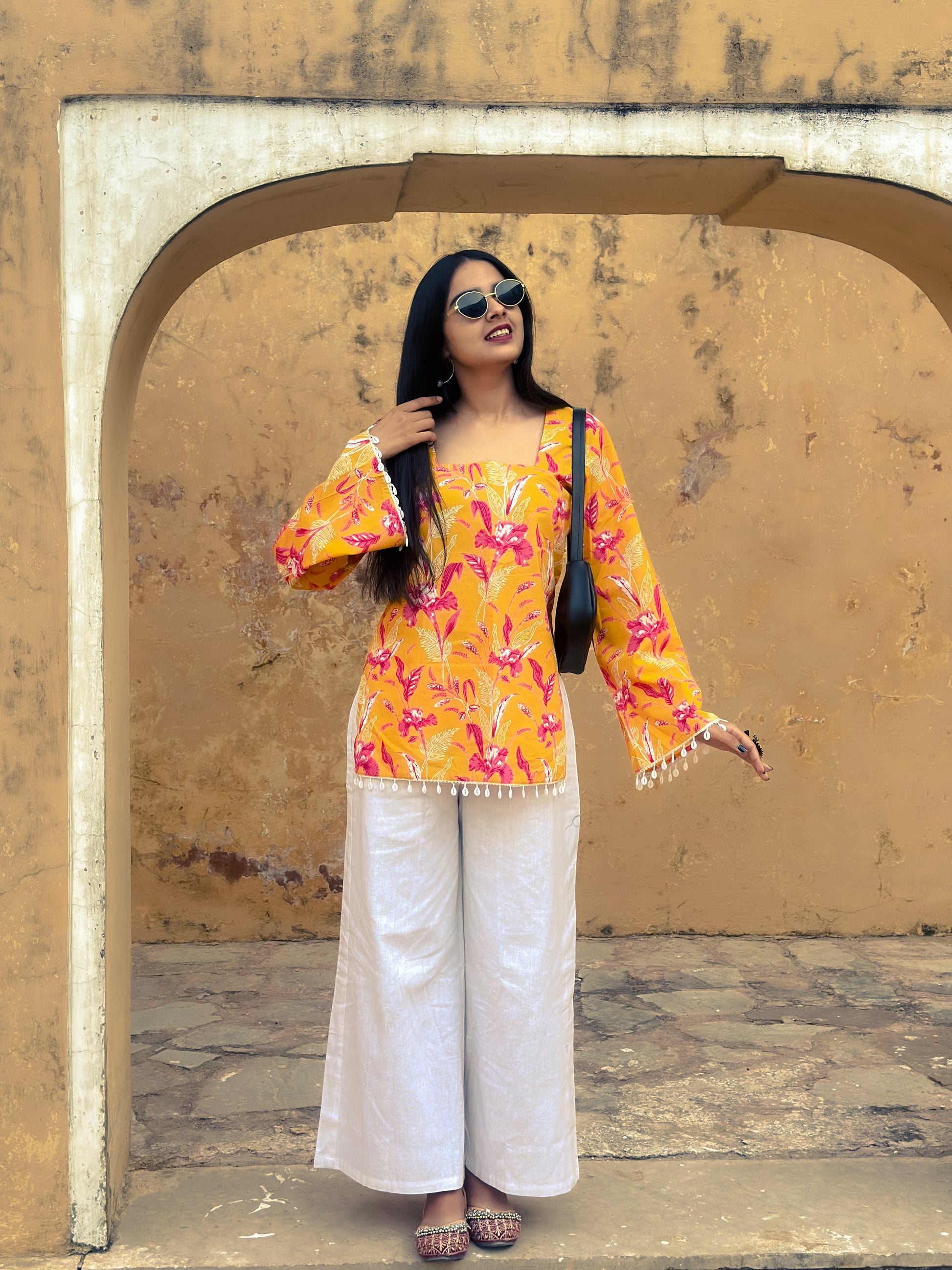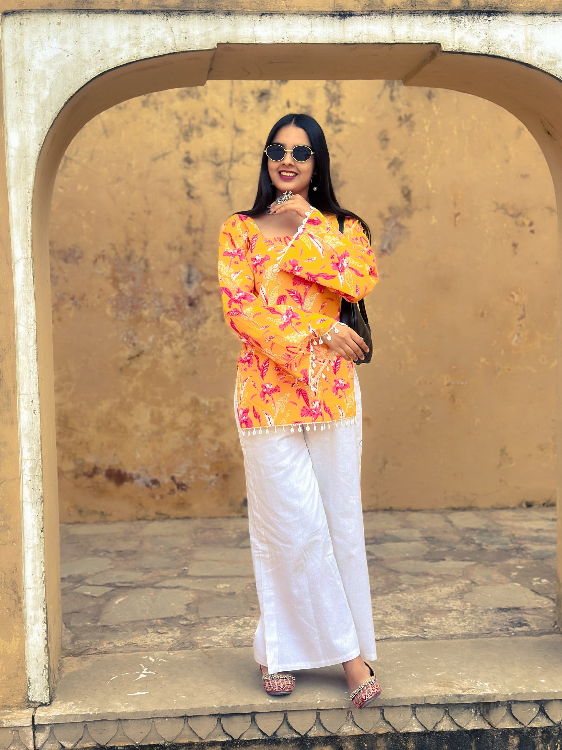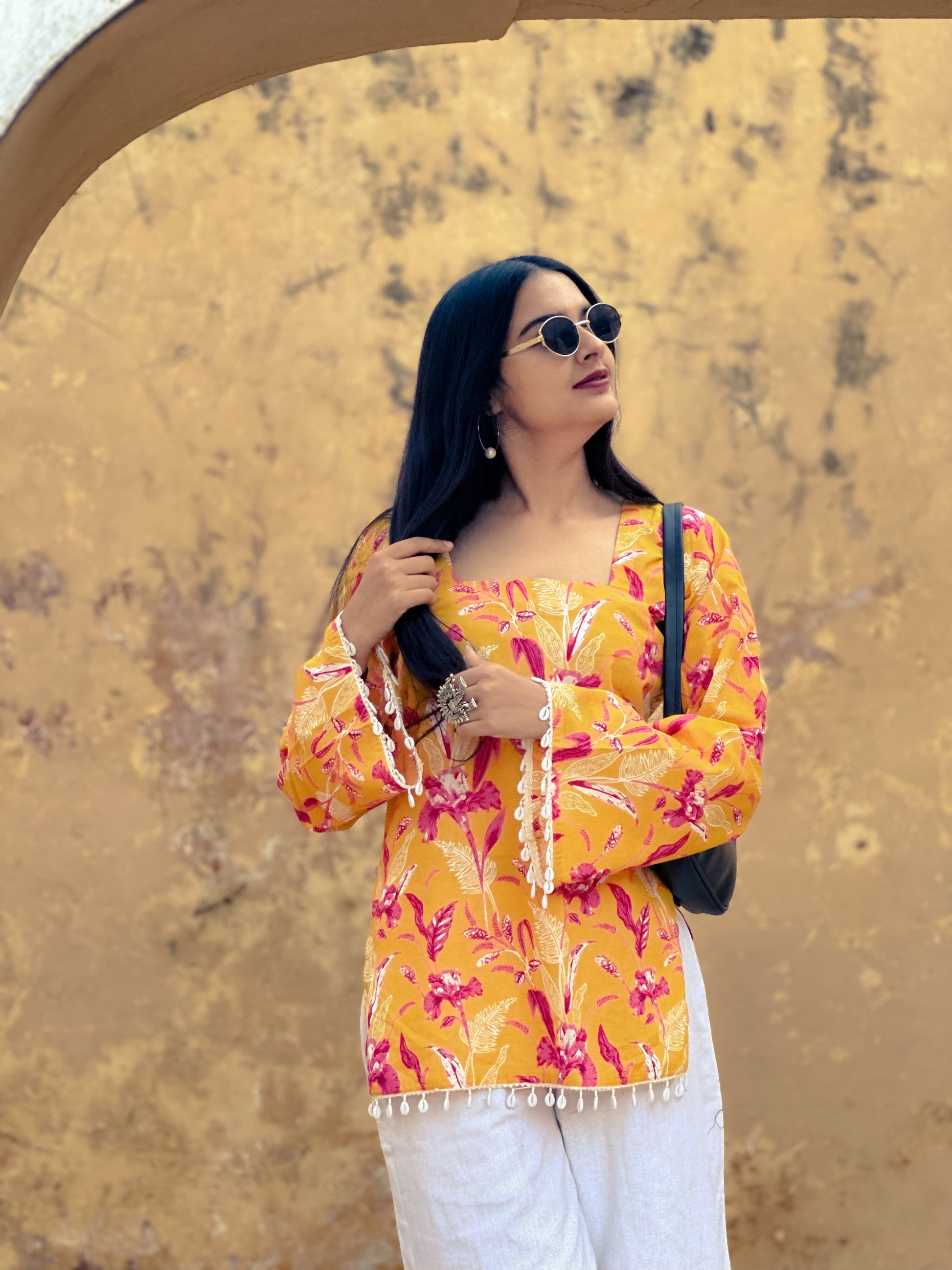 Brighten your child's wardrobe with this charming yellow floral printed kurti, expertly designed for comfort and style. The delicate floral pattern adds a playful touch, while pearl tassel sleeves elevate the look with refined detailing. Crafted from soft, breathable fabric, this kurti ensures all-day comfort for active kids. Perfect for casual outings, family gatherings, or festive occasions, it pairs effortlessly with leggings or churidars. A versatile essential that combines traditional aesthetics with contemporary flair.